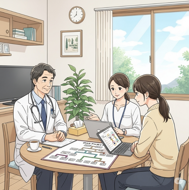ヒトゲノム研究の進歩により、遺伝子解析の対象となる疾患が急増しています。当院では、遺伝に関するご相談に対応するために「遺伝カウンセリング外来」を設置しました。臨床遺伝専門医や認定遺伝カウンセラーが、身体的・心理的・社会的な側面に配慮した包括的支援を行います。