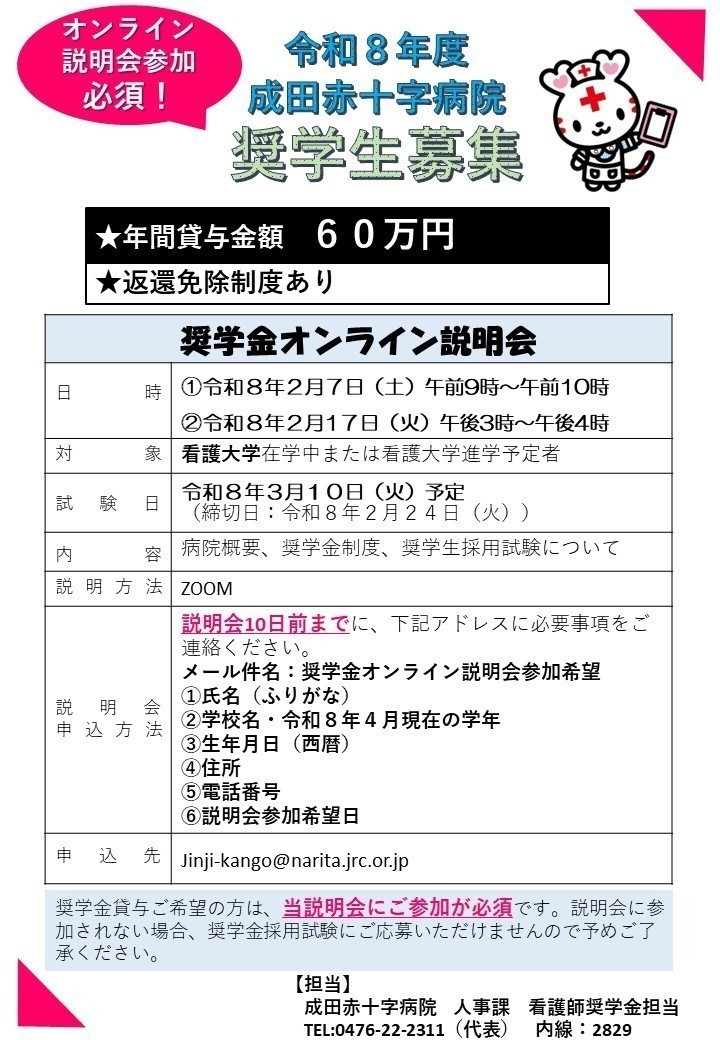 令和7年度成田赤十字病院奨学生募集に伴い、オンライン説明会を以下の通り開催いたします。